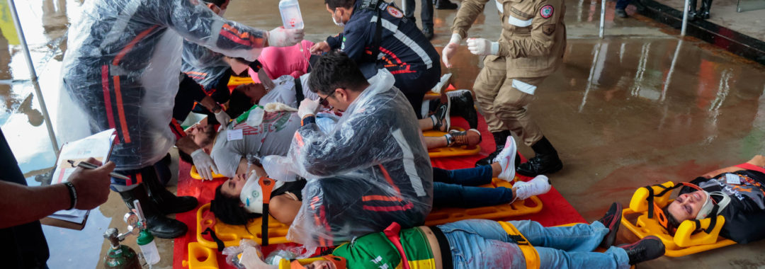 Após dois dias de treinamento teórico, que aprofundaram protocolos de atuação e fluxos de integração, os participantes foram desafiados a aplicar os conceitos discutidos em sala. A ação prática simulou uma briga de torcida que culminou em pisoteamento e esmagamento, com 64 vítimas, encenadas por voluntários, para avaliar protocolos de triagem, atendimento e encaminhamento dos feridos. O objetivo foi capacitar agentes de saúde e segurança para lidar com desastres e fortalecer a capacidade de resposta das equipes diante de situações de emergência.